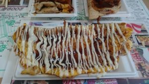 Ikayaki, A grilled squid wrapped in a thin savory pancake. You can choose various toppings so it gives you reasons to come and try several times;)